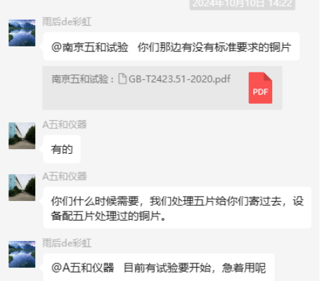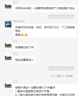 為了更好地說(shuō)明銅片試驗(yàn)的重要性,下面分享一個(gè)檢測(cè)公司的銅片試驗(yàn)實(shí)際案例:2024年8月份合肥******檢測(cè)技術(shù)有限公司第一次采購(gòu)我司一臺(tái)型號(hào)為“WHQ-300B”型的混合氣體腐蝕試驗(yàn)箱,設(shè)備被運(yùn)送到客戶指定的場(chǎng)地安裝調(diào)試運(yùn)行。安裝調(diào)試后,客戶后期自行進(jìn)行一次銅片增重試驗(yàn),我司技術(shù)人員進(jìn)行線上指導(dǎo)操作,試驗(yàn)結(jié)束之后客戶將數(shù)據(jù)發(fā)給我司,以下是客戶和我司聊天記錄以及客戶做的數(shù)據(jù)信息: